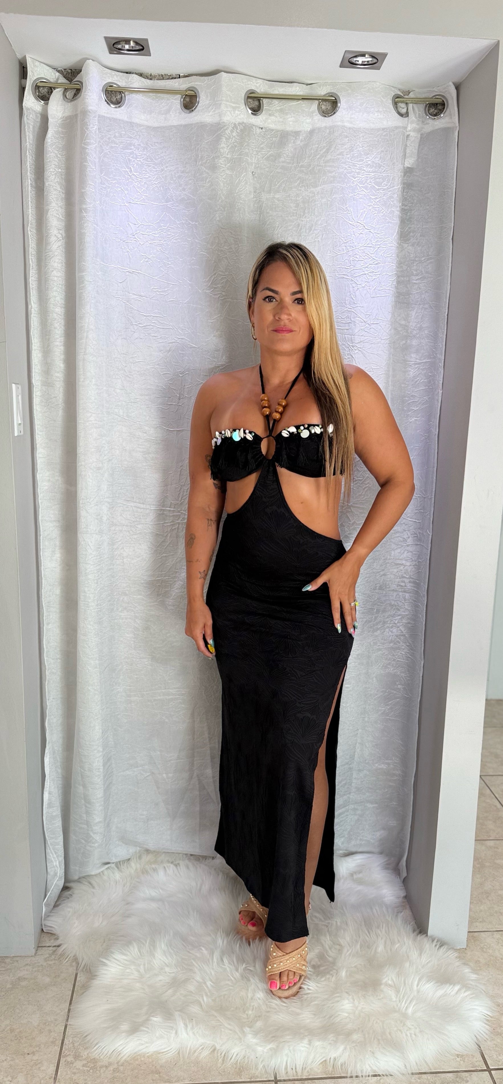 Un traje playero elegante y versátil que combina estilo y frescura. Su diseño con cut-out frontal, detalle de conchas y detalles cocidos a mano con mucho amor, en el busto y amarre al cuello lo convierte en la pieza ideal para destacar este verano. Úsalo como cover up sobre tu bikini favorito o como vestido veraniego para un look sofisticado junto al mar o en una salida tropical.