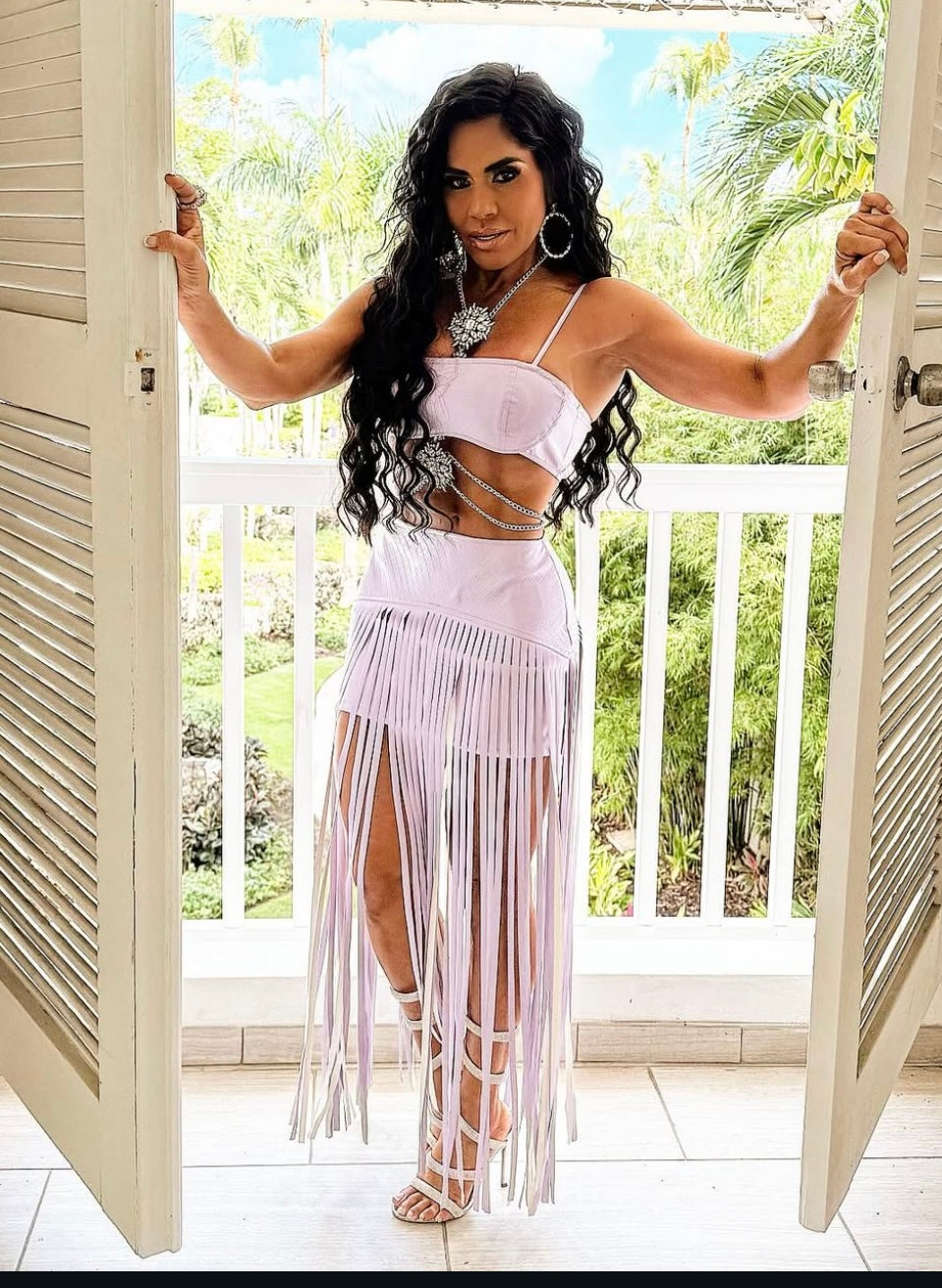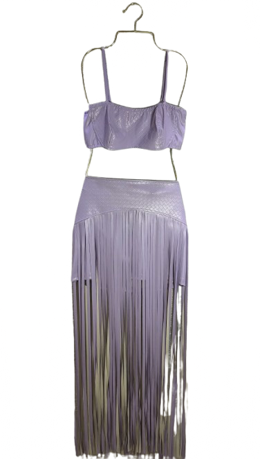 Conjunto lilac elegante con top delicado y falda corta con flecos largos. Glamuroso, femenino y sofisticado, ideal para eventos especiales en la playa o resort. Perfecto para combinar con accesorios llamativos.