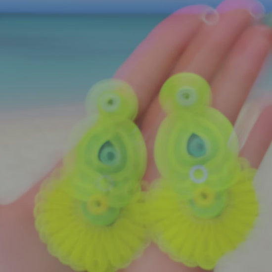 Brilla con nuestros aretes Emerald Lime Wave Drop , una pieza artesanal inspirada en los colores refrescantes del Caribe.