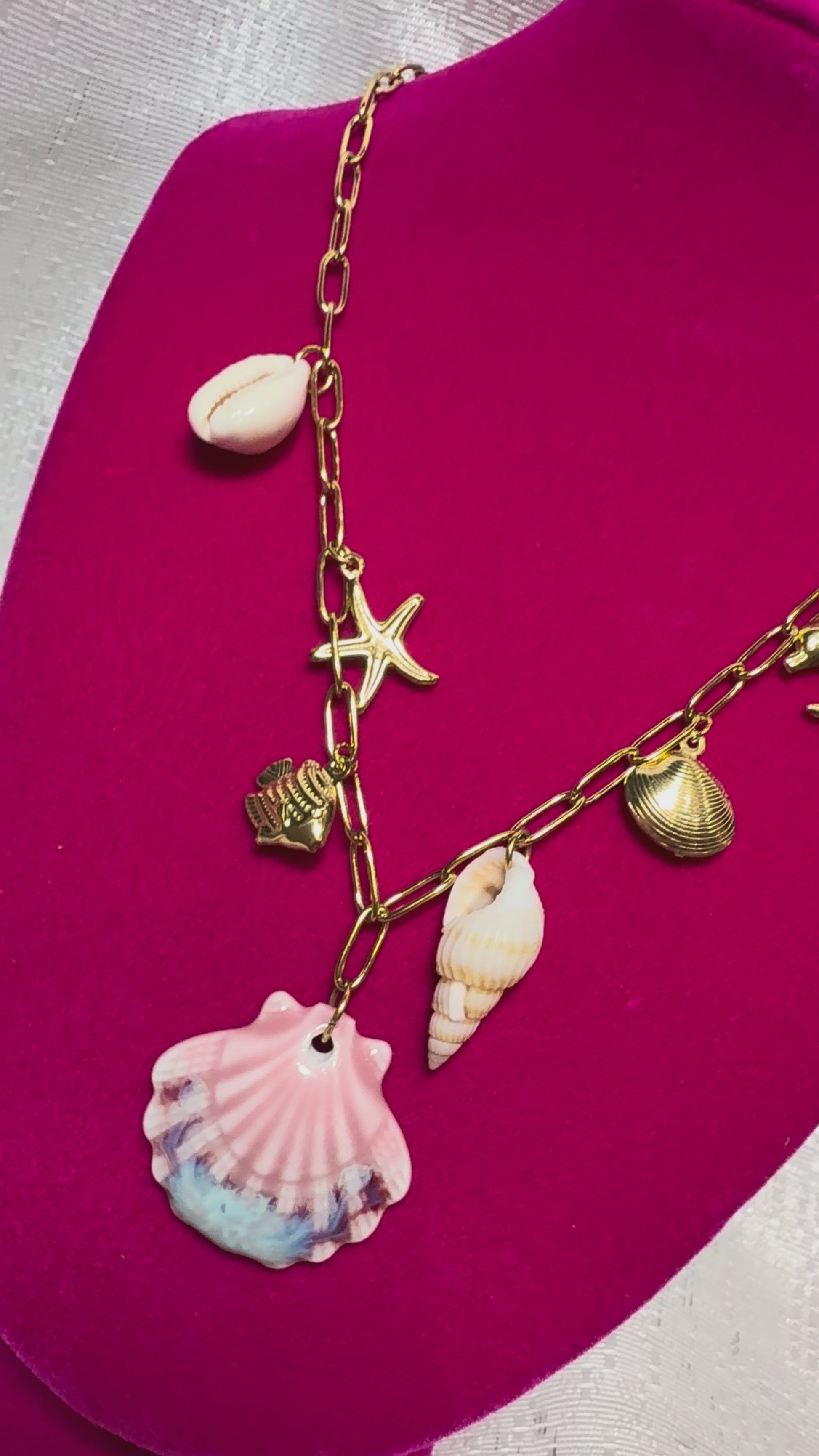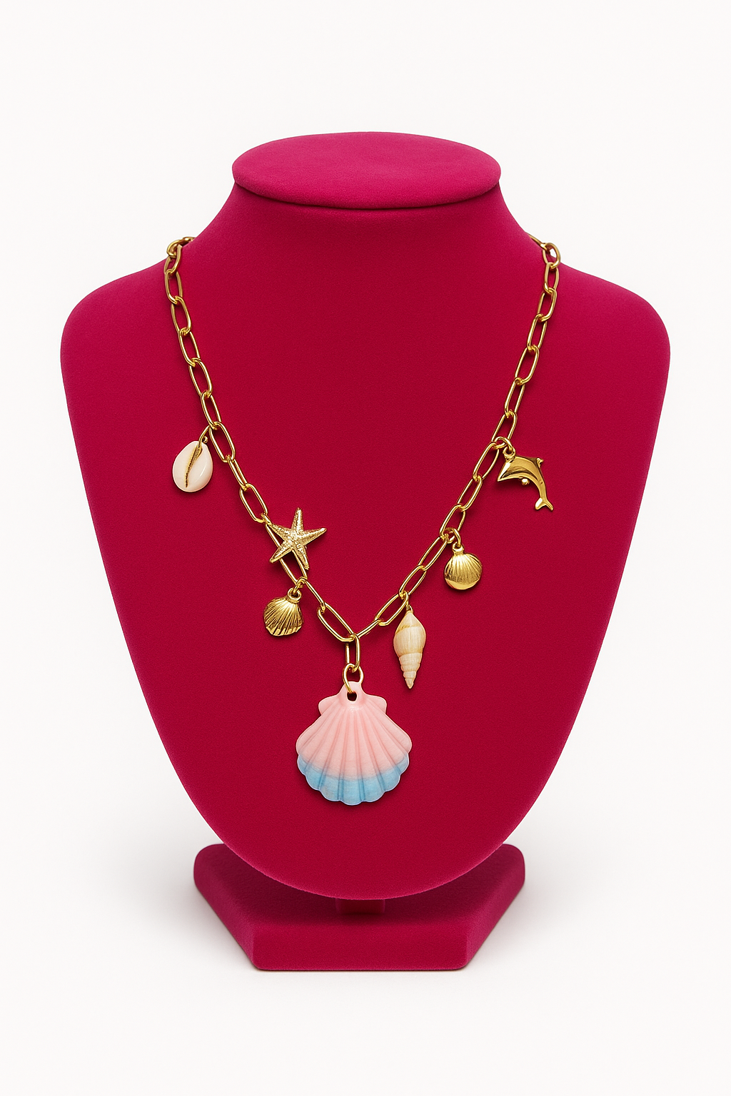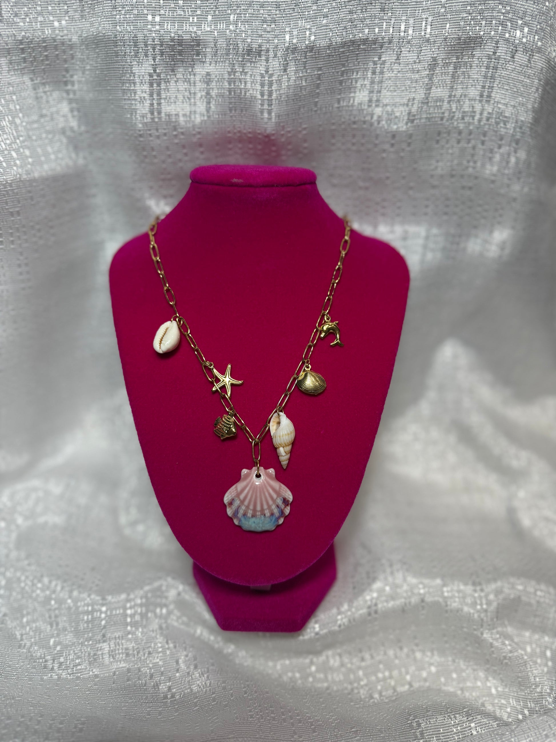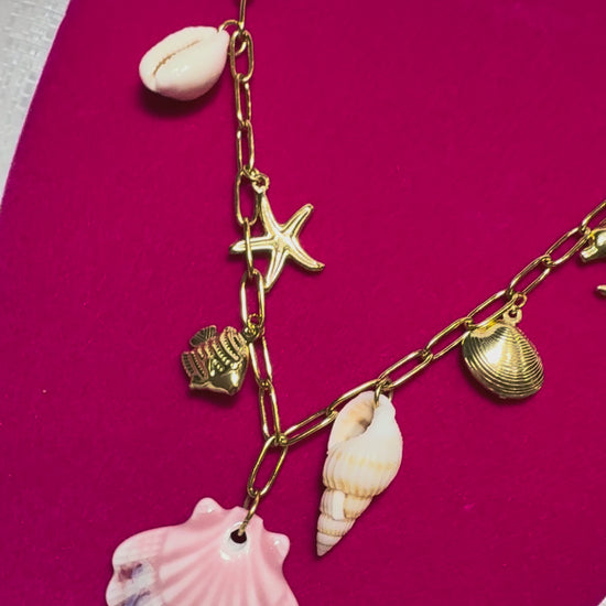 Collar dorado con detalles marinos que evocan la magia del océano: una concha bicolor rosa y azul al centro, acompañada de una estrella de mar dorada, un delfín, un caracol y pequeños detalles costeros. Su diseño delicado y veraniego combina el brillo del dorado con tonos suaves inspirados en el mar, perfecto para quienes aman el estilo tropical y elegante de Sirenia Boutique.