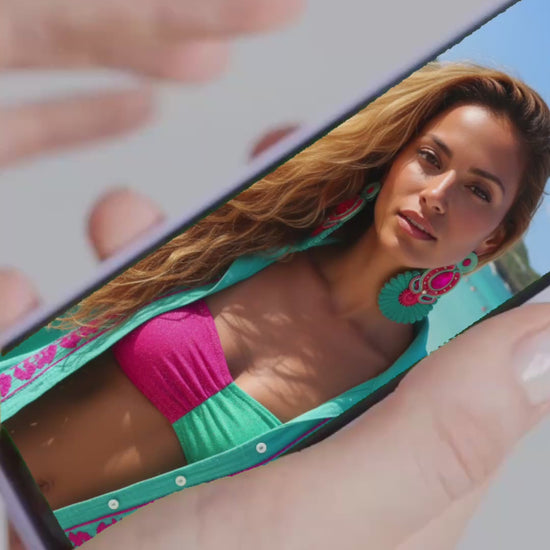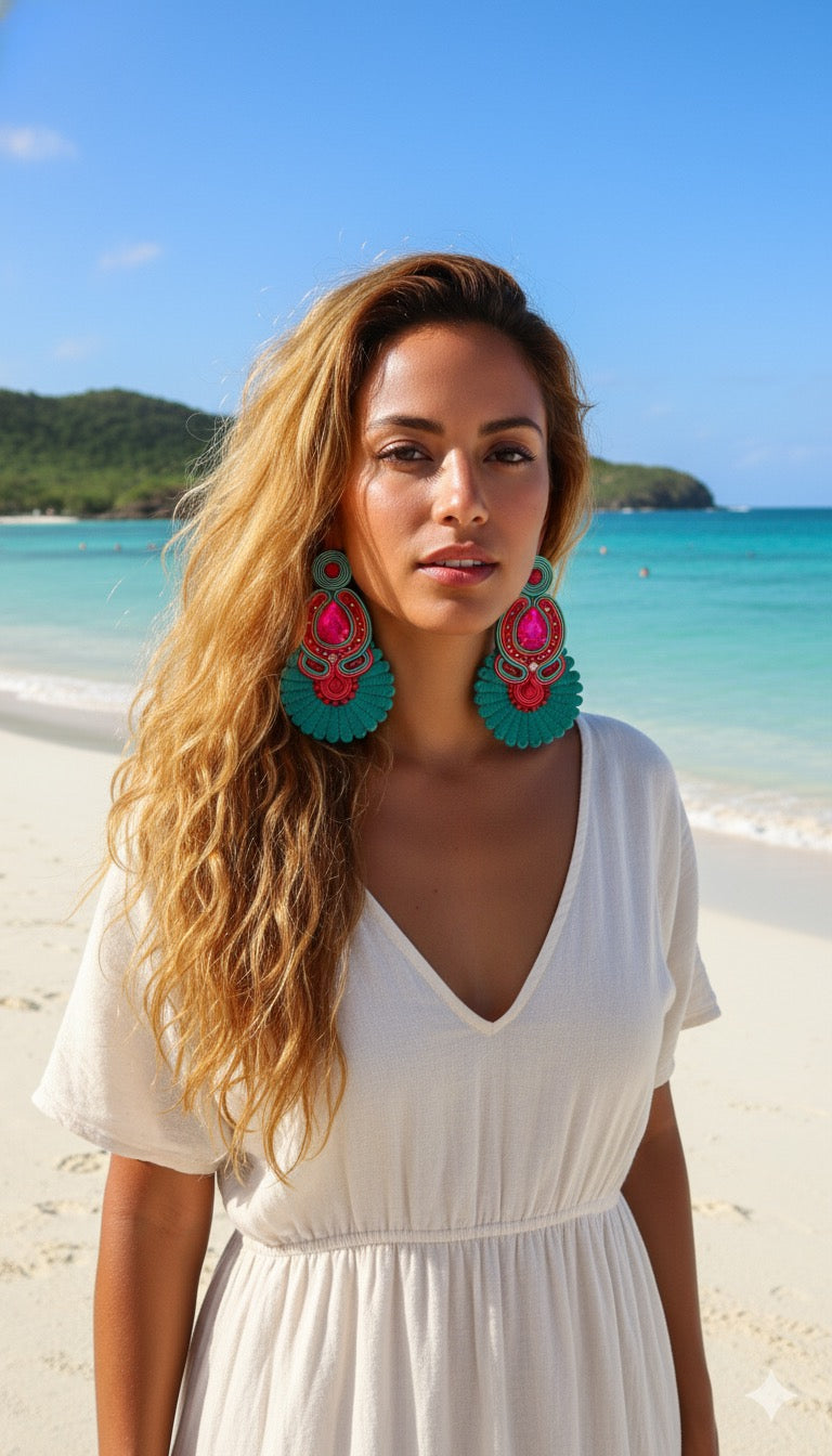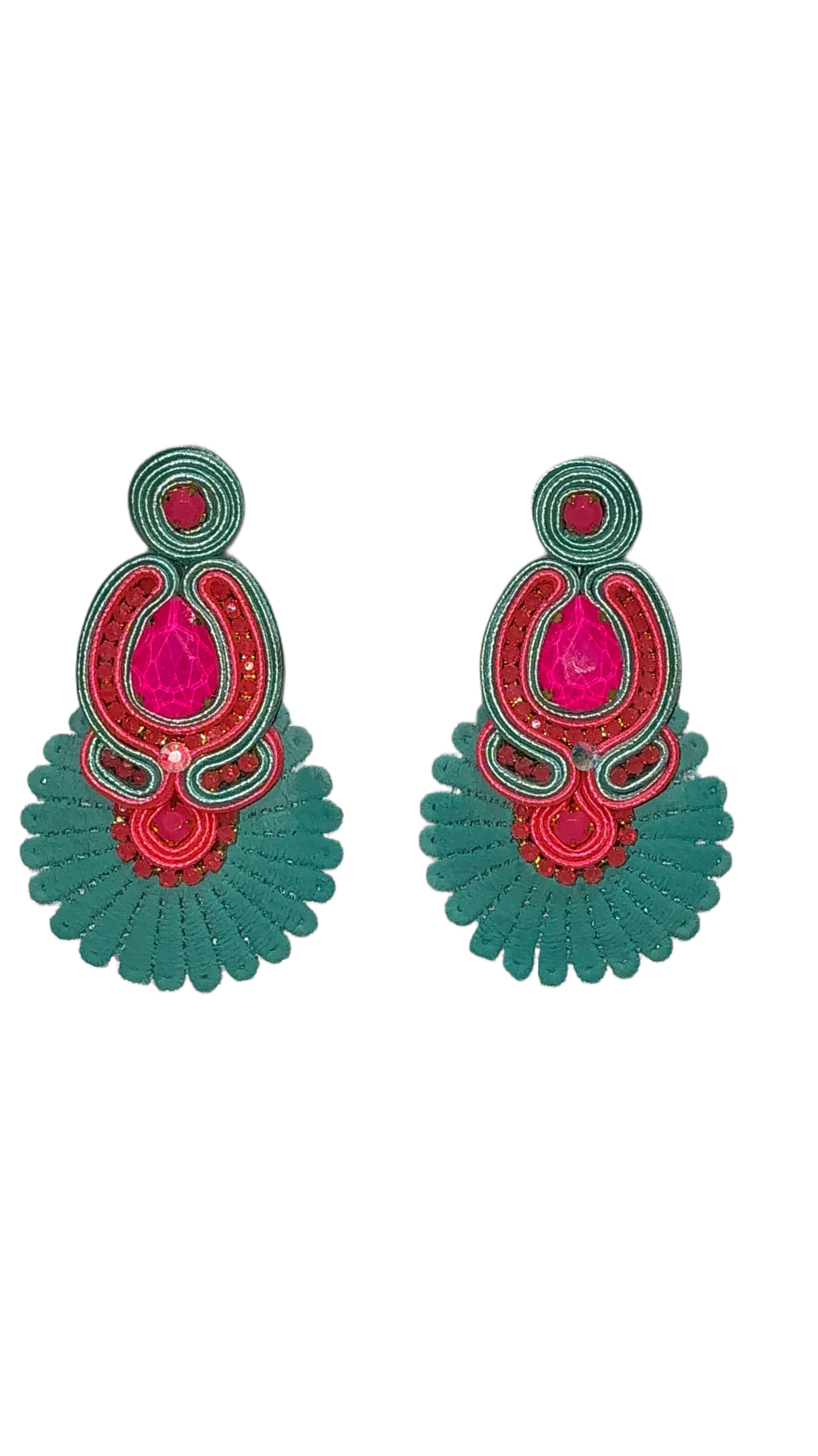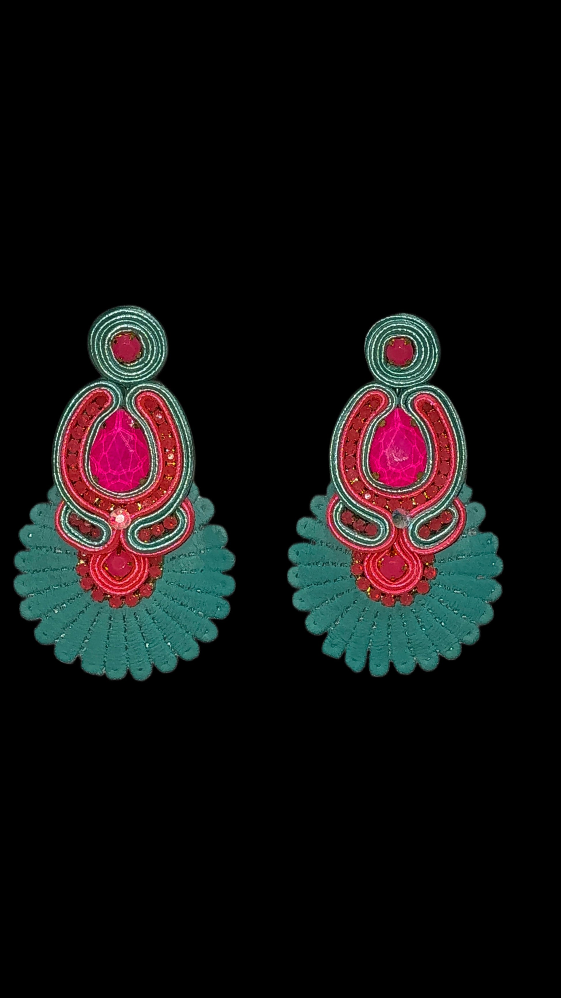 Estos maxi aretes artesanales, elaborados con la técnica Soutache, fusionan un vibrante fucsia pasión con un elegante turquesa esmeralda. Ligeros y llenos de movimiento, son perfectos para destacar en cualquier evento, aportando un toque exótico y festivo a tu look. Hechos a mano con detalles en pedrería.