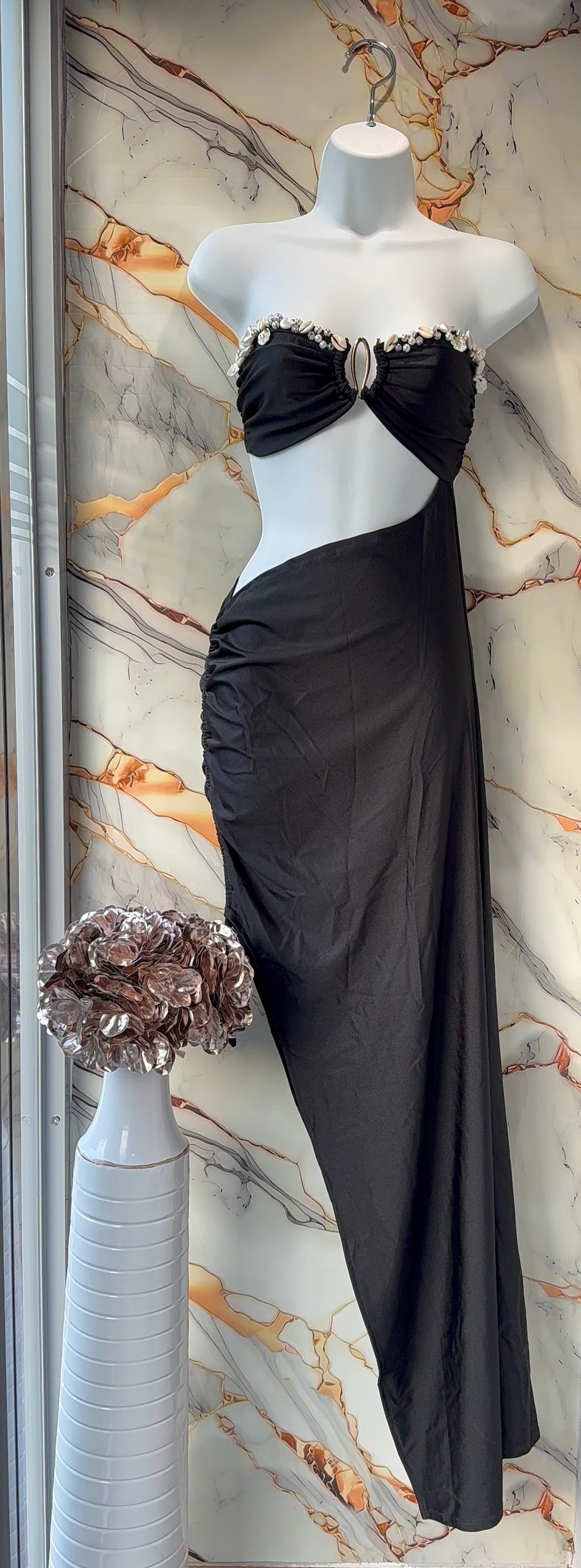 Este vestido cut-out estilo sirena combina elegancia y sensualidad con un toque playero sofisticado. Presenta un top tipo bandeau con detalles de perlas y caracoles que añaden un acento natural y chic, mientras su diseño asimétrico abraza la figura resaltando curvas de forma delicada.