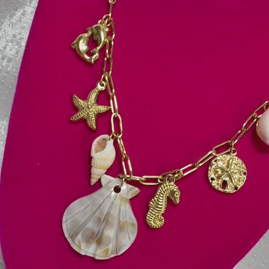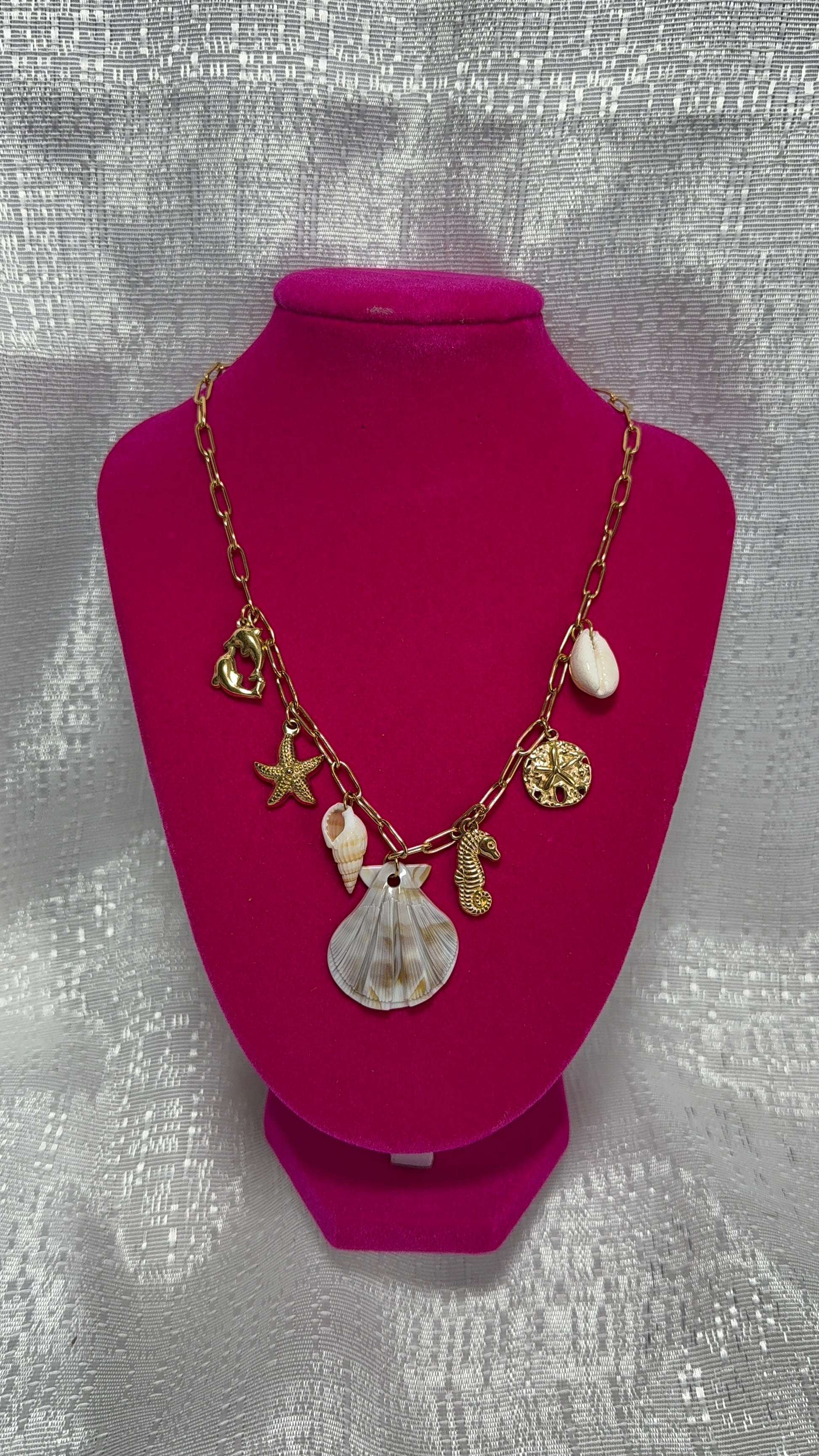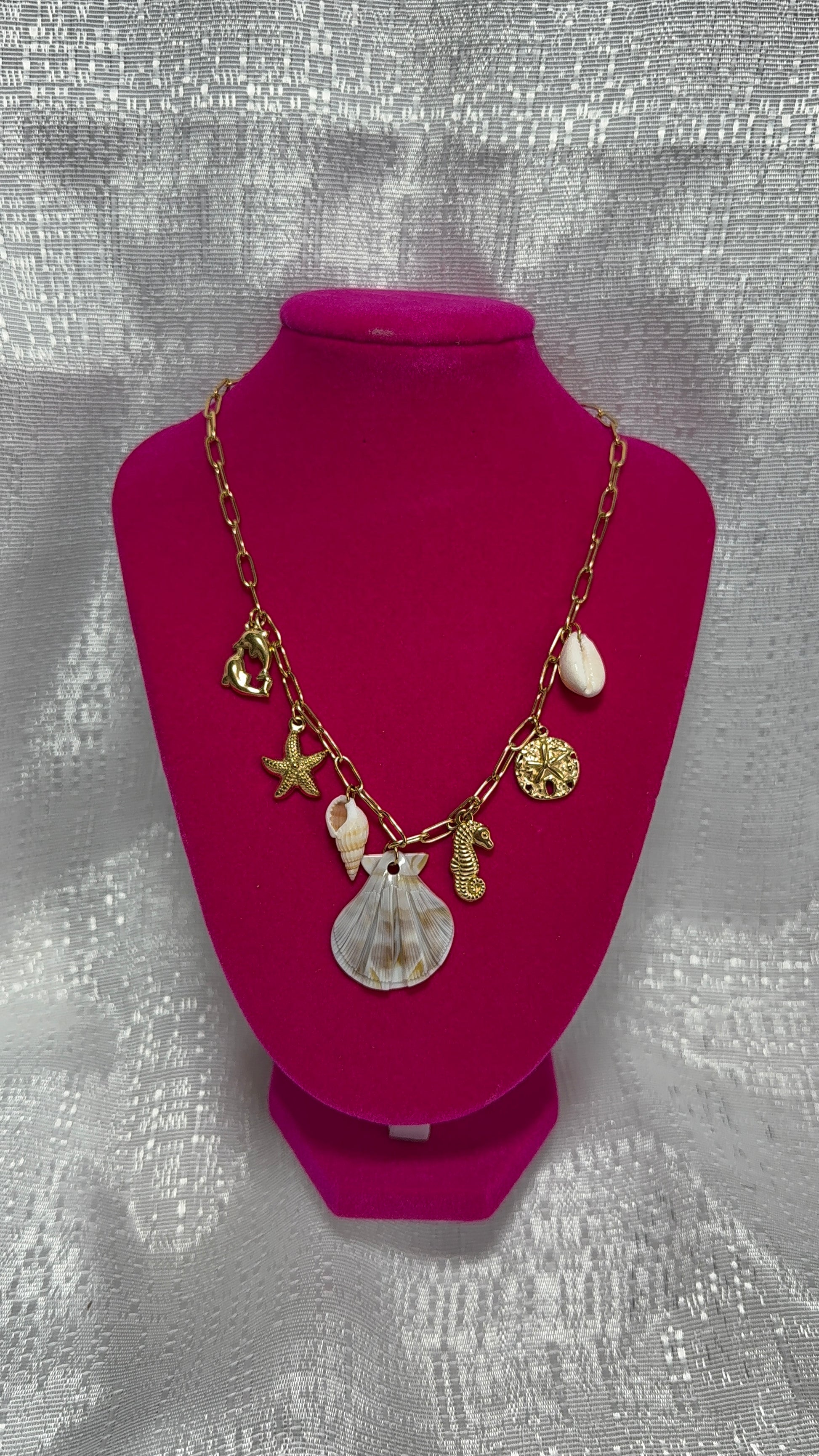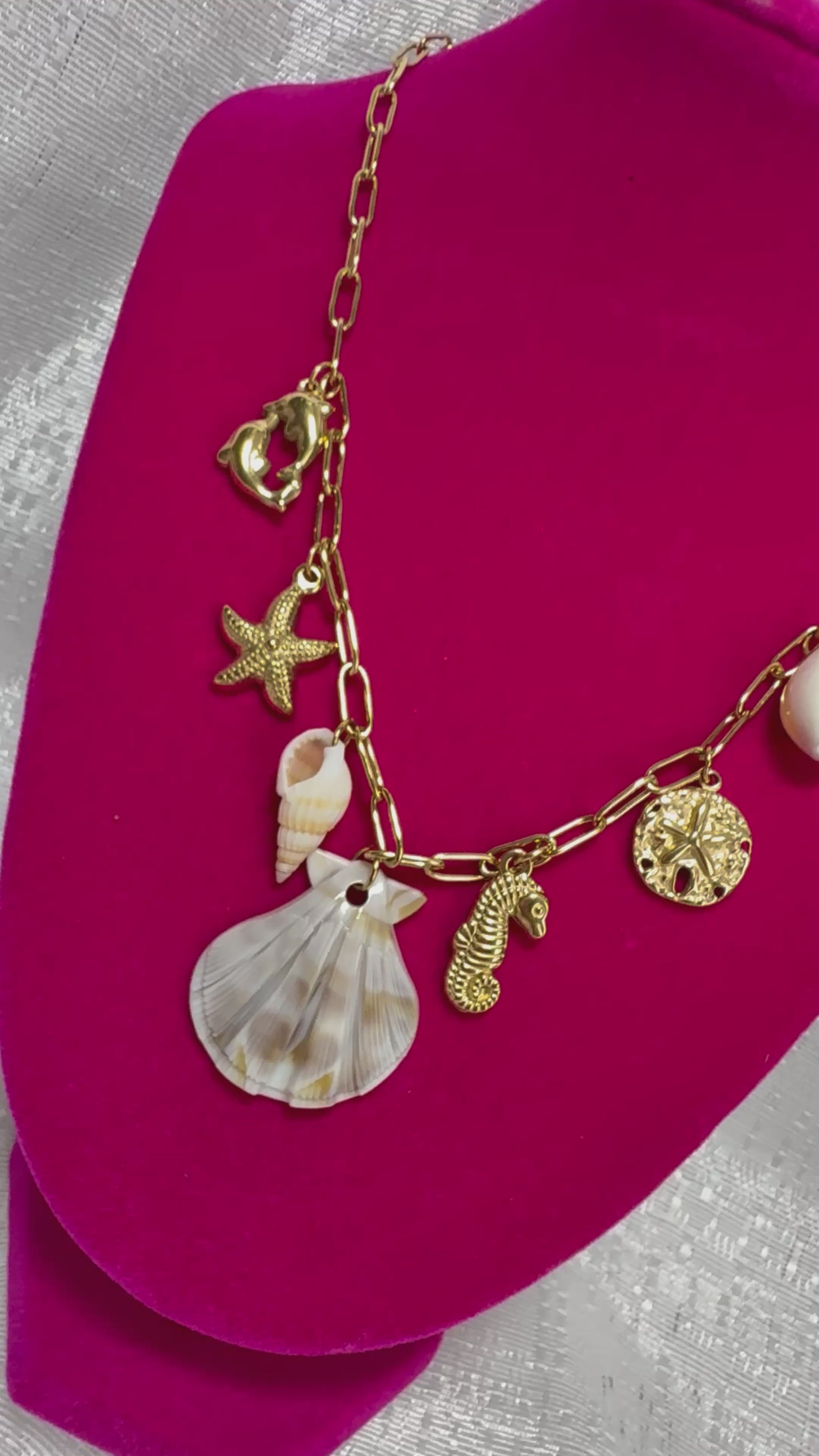 Collar dorado con detalles inspirados en el mar: estrella de mar, caballito de mar, caracoles y una concha central natural. Su diseño elegante y veraniego combina tonos dorados con detalles marinos, ideal para resaltar tu estilo tropical y chic en la playa o en la ciudad.