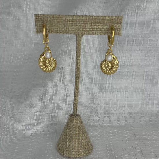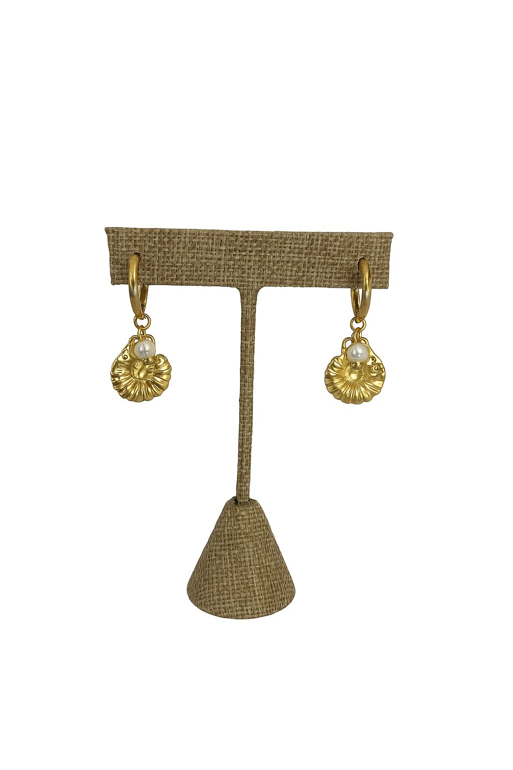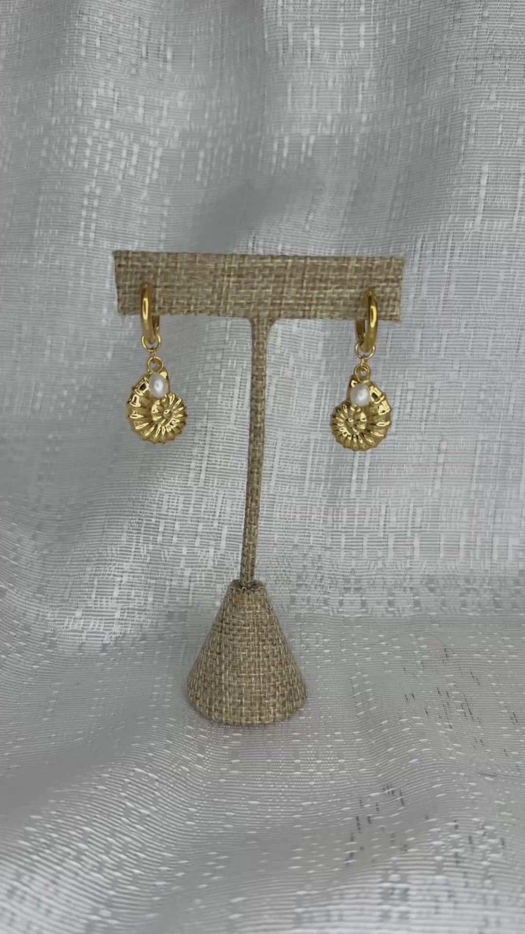 Elegantes aretes dorados con forma de caracol marino y un delicado detalle de perla que aporta un toque de sofisticación costera. Su diseño combina la esencia del océano con la elegancia del dorado, creando una pieza versátil y femenina ideal para complementar cualquier look veraniego o de noche. Perfectos para brillar con el estilo único de Sirenia Boutique.