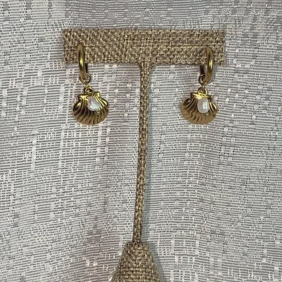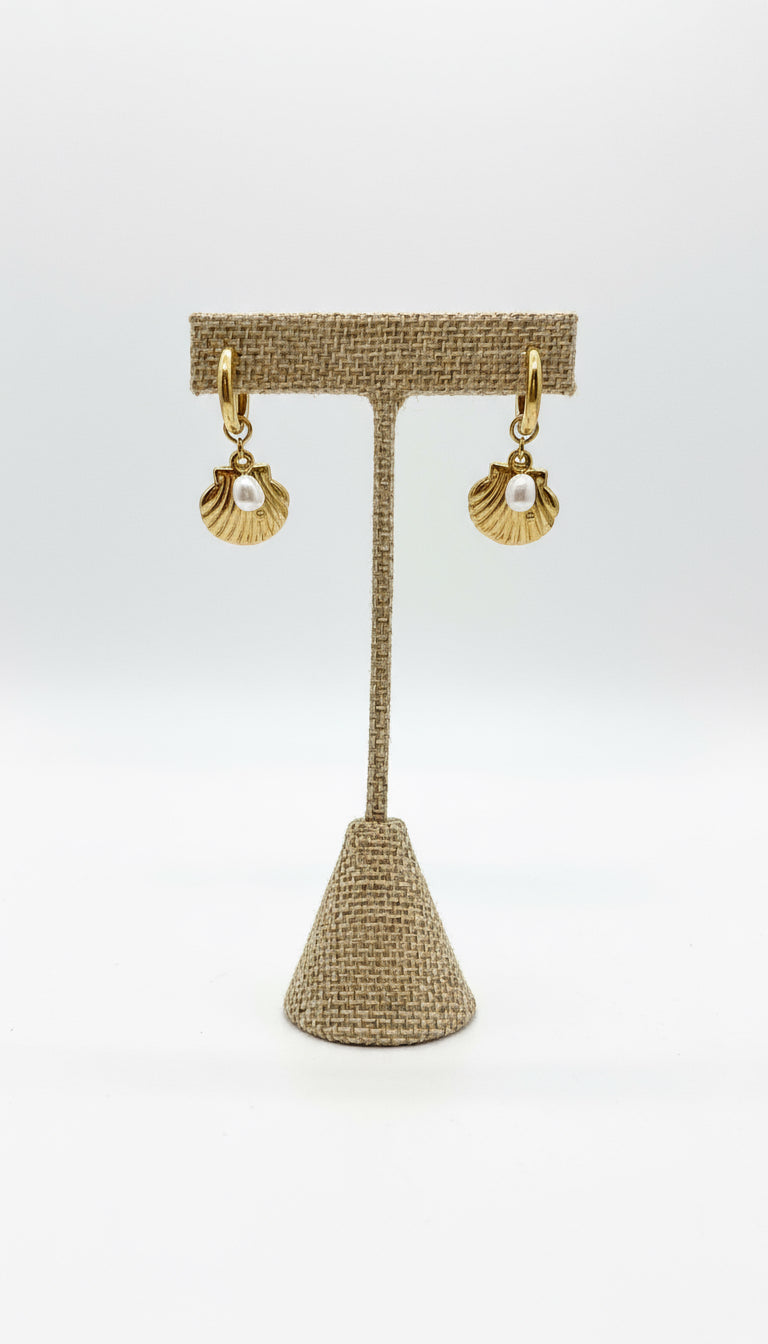 Delicados aretes dorados en forma de concha marina con un toque elegante gracias a una pequeña perla en el centro. Su diseño inspirado en el mar los convierte en el complemento perfecto para realzar tu look veraniego con sutileza y estilo. Ideal para combinar con el Sea Shell Necklace y lograr un conjunto armonioso y sofisticado digno de una sirena moderna. 🐚✨