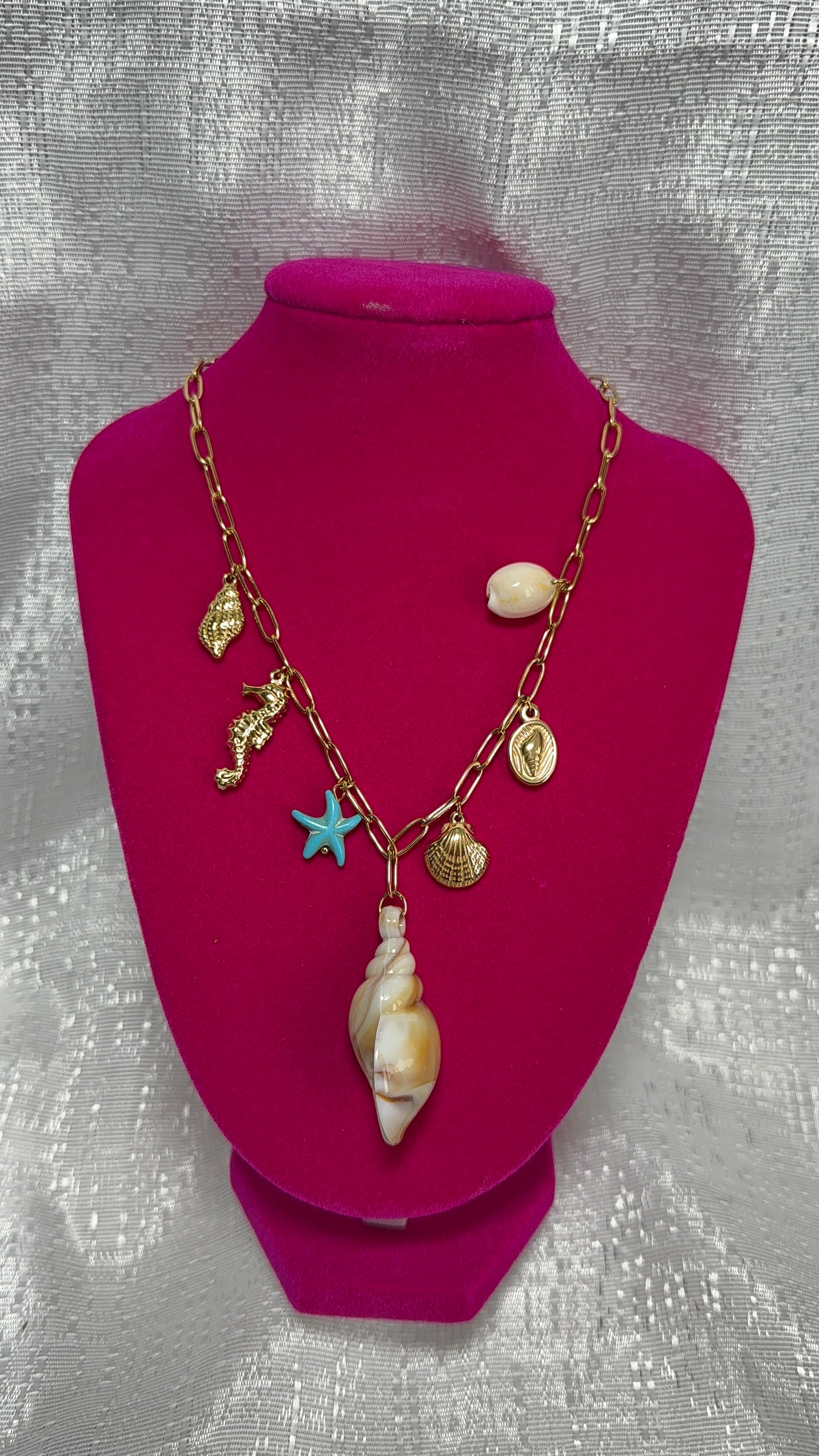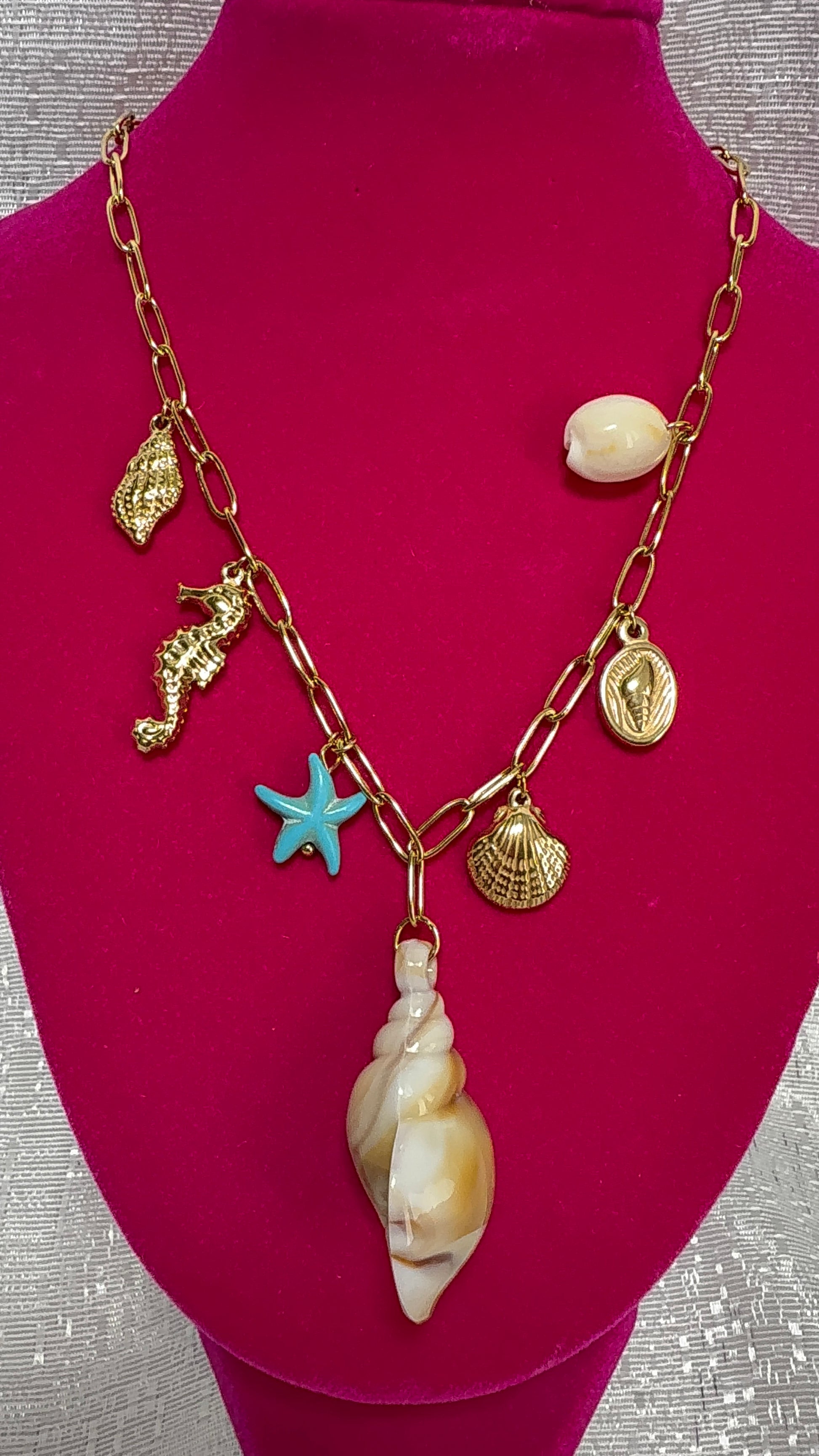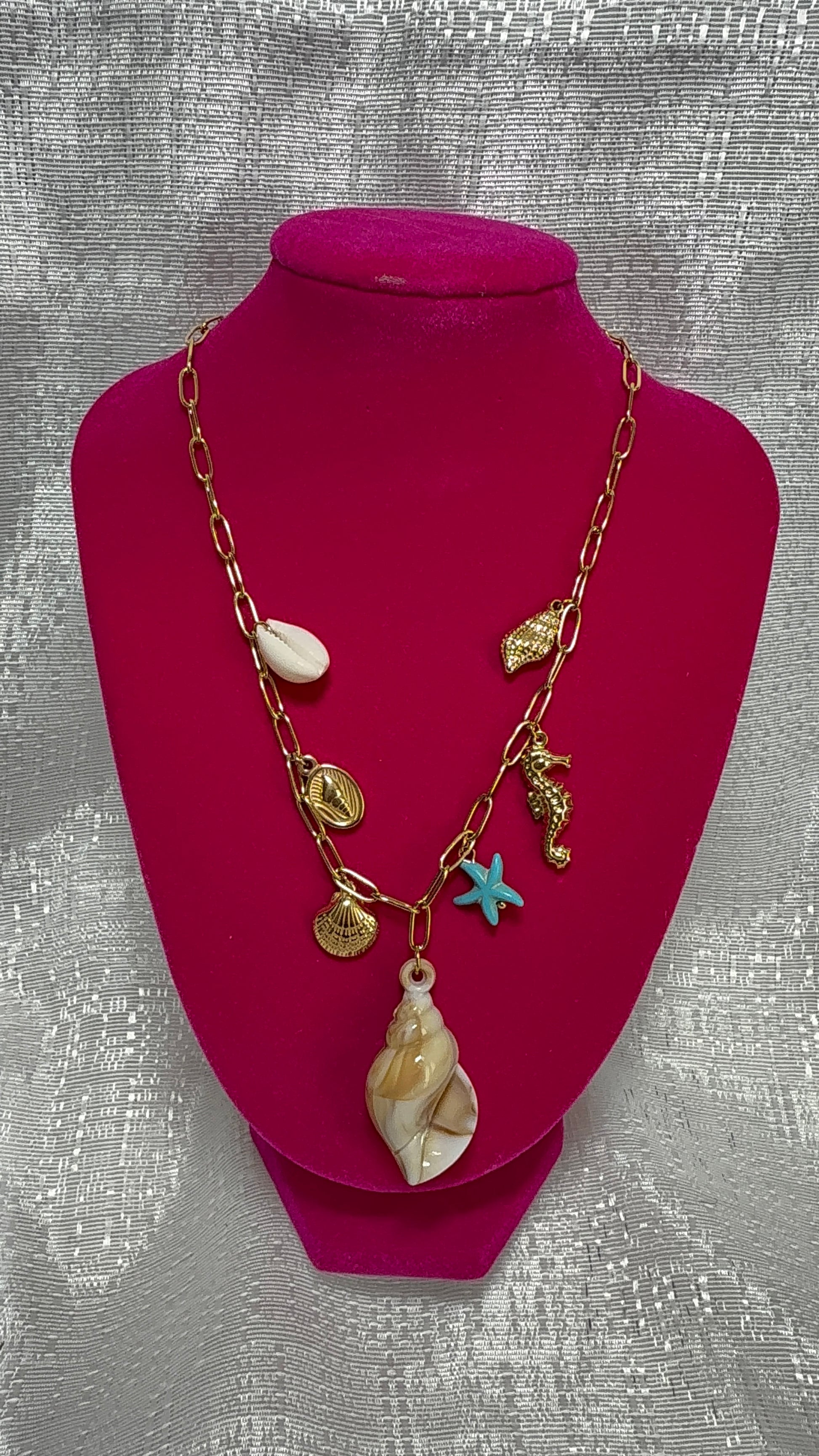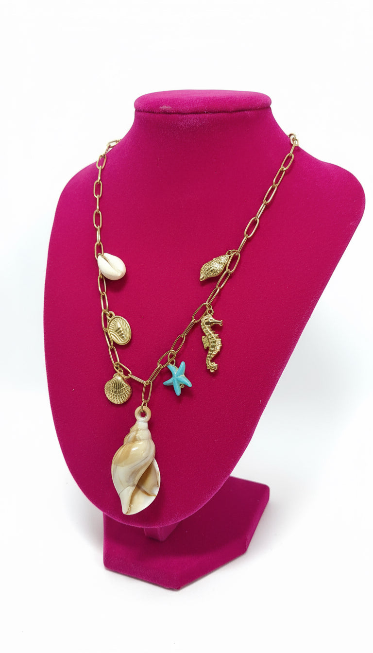 Collar inspirado en los tesoros del mar, con encantos dorados de caballito de mar, conchas y caracoles, acompañado de una estrella marina turquesa y una concha natural central. Una joya que captura la esencia del verano y el brillo del océano. Ideal para complementar tus looks de playa o resaltar tu estilo tropical con elegancia.