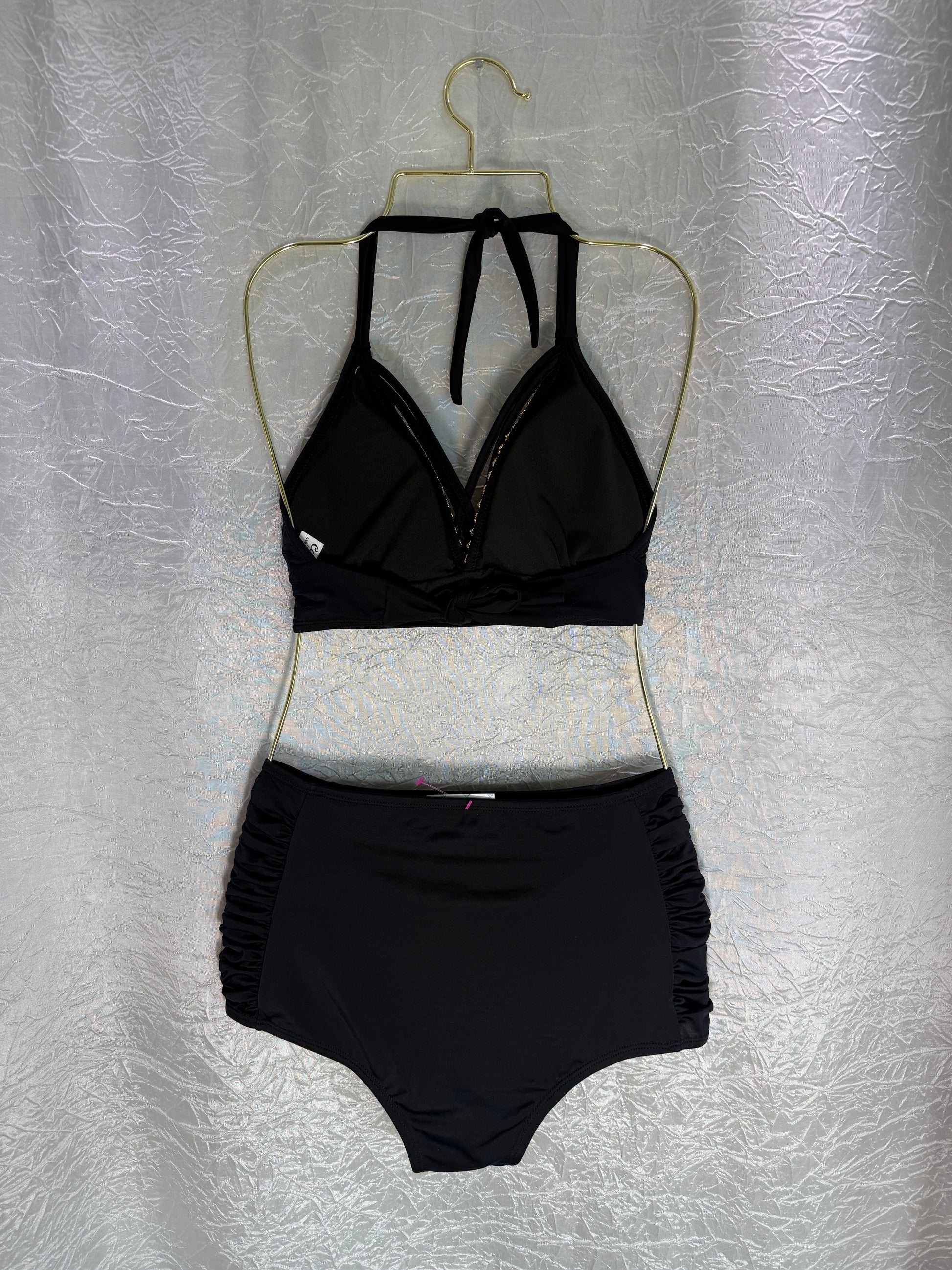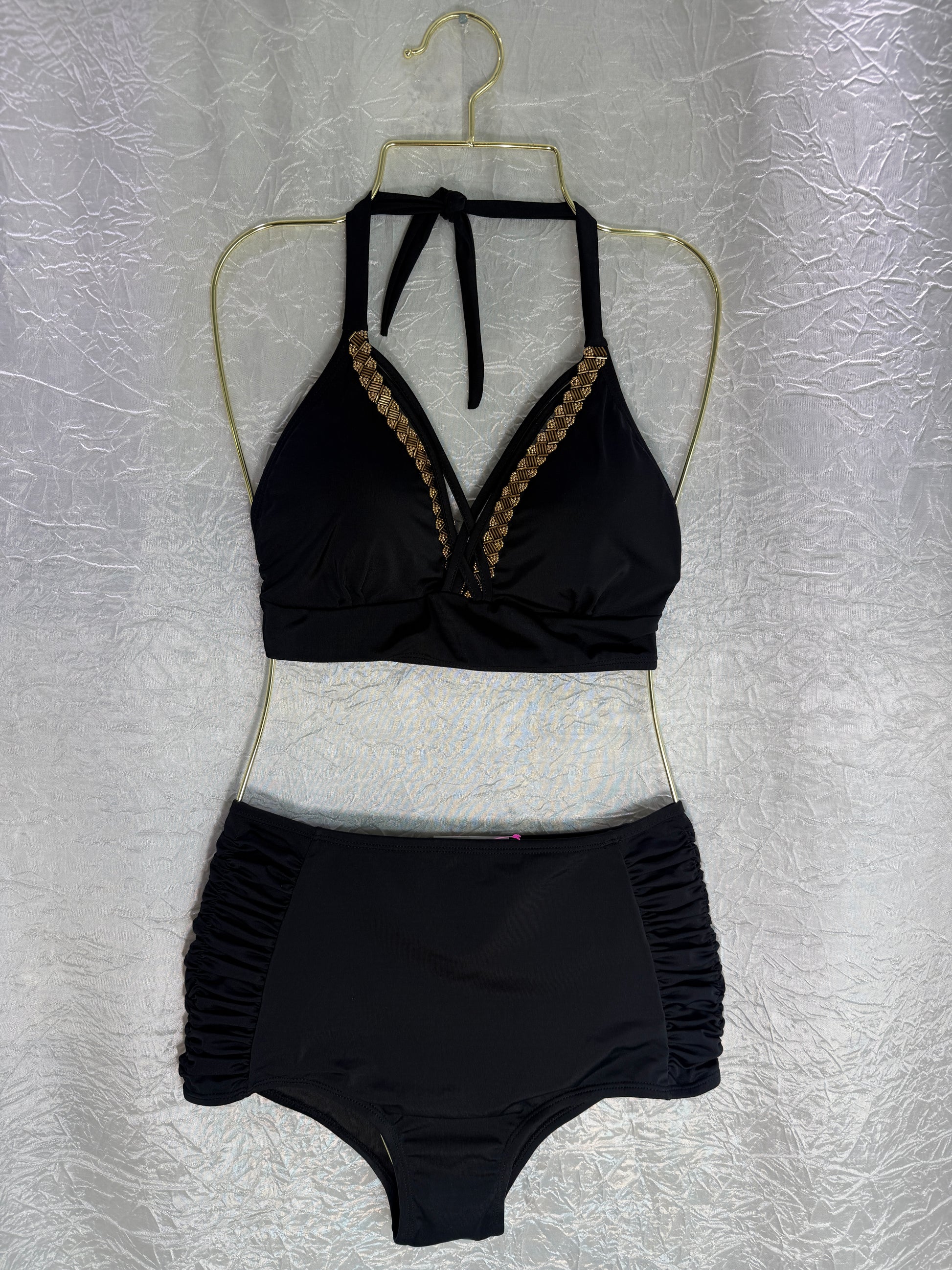 Traje de baño alto con control de abdomen, ideal para mamás que desean mayor comodidad y soporte. La parte superior tiene un diseño con tirantes ajustables y detalles en la parte frontal, mientras que la parte inferior es de corte alto con fruncido a los lados, proporcionando mayor cobertura y estilo. Es perfecto para quienes buscan un bikini que ayude a moldear y resaltar la figura.