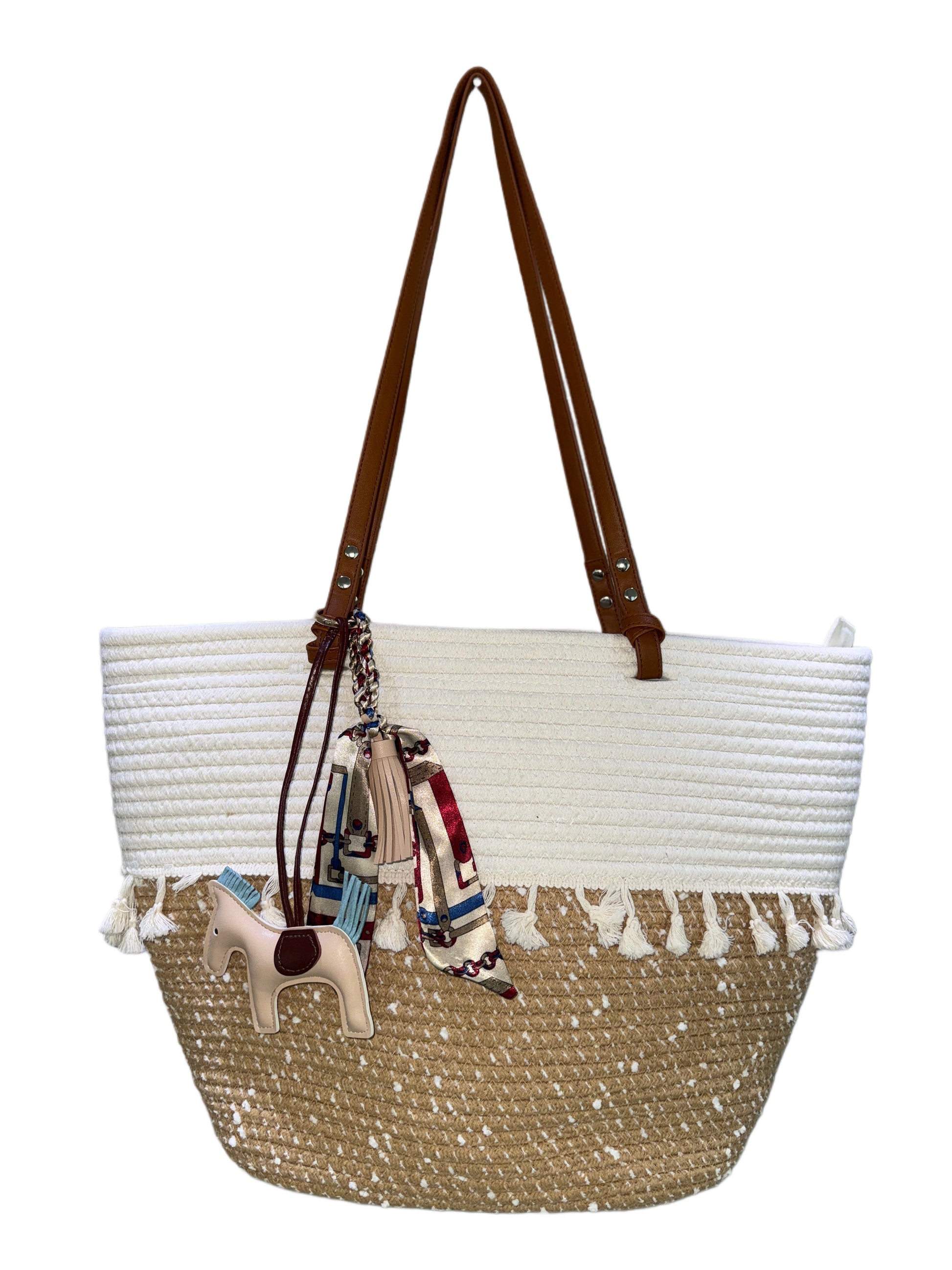 Bolso tote estilo playero con diseño bicolor en tonos naturales, con detalle decorativo y lavero. Ideal para llevar todo lo necesario a la playa o un día casual al aire libre. Espacioso, ligero y con un toque bohemio chic.